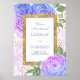 Flores de aquarela azul e roxa e sinal de boas-vindas do quadro de confetti com brilho dourado