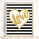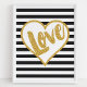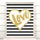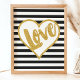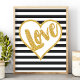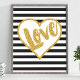 Linda e moderna citação de pincel da tipografia moderna. Amor. Apresentando uma bonito estrutura metálica de brilho cardíaco em ouro e letras douradas com listras pretas e brancas.