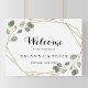 Este sinal de boas-vindas de ouro geométrico é perfeito para um casamento russo. A design apresenta galhos botânicos verdes de eucalipto, desenhados à mão, e folhas que enfeitam um quadro elegante. Faça esta poster com o nome da noiva e do noivo, e a data do casamento.