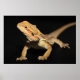Um curioso dragão barbudo olhando para frente em frente a um fundo preto.