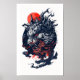 Esta design é de uma Cabeça de Dragão Furiosa. Seus olhos são vermelhos brilhantes, mostrando uma intensidade monstruosa com a boca aberta, brilhando seus dentes agudos. O fundo é uma simples lua vermelha com um efeito grunge preto e branco.
