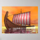 Drakkar ou navio viking flutuando no oceano pelo pôr do sol -3D renderização