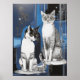 Poster em uma ilustração de dois gatos sentam-se graciosamente contra um fundo azul profundo, abstrato. As texturas realistas de pelo com ousada linhagem e elementos geométricos criam uma atmosfera moderna e surreal. Seus olhos amarelos expressivos contrastam impressionantemente com os arredores legal.