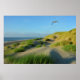 Sanddünen mit grünem Strandhafer e der Nordseküste auf Zeeland no den Niederlanden, mit Meer, blauem Himmel und Einer Möwe