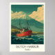 Immerse yourself in the maritime life of Dutch Harbor, Alaska, with this retro travel design. Showcasing a vibrant red fishing boat against a dramatic ocean and mountain backdrop.