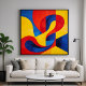 An abstract artwork that is a striking exploration of color and form, featuring sweeping, fluid curves that playfully intersect with sharp, geometric boundaries. Rendered in vivid primary hues. This piece creates a continuous sense of motion and vibrant, kinetic energy, rendered in colors of deep crimson, brilliant sunshine yellow, and cobalt blue. Perfect for modern, minimalist, or mid-century interiors, this artwork acts as a brilliant focal point that instantly brings a room to life. The interlocking ribbons of color create a mesmerizing optical depth, inviting the viewer to trace the endless, rhythmic loops of the composition. It’s an ideal choice for a living room, a creative office, or any room that needs a pop of color.