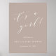 Simples e elegante sinal de boas-vindas ao chá de fraldas mostra "é uma menina" em letras brancas de caligrafia moderna em um fundo bege neutro. Personalize com seu nome e data do evento abaixo.