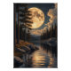 Uma lua cheia gigante e radiante domina a linha do horizonte, lançando sua luz dourada sobre as águas calmas de um lago emoldurado por florestas e montanhas. A cena transmite magia, serenidade e o poder atemporal da natureza em perfeita harmonia.