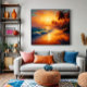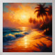 Uma pintura que captura a poesia de um pôr do sol tropical, onde o sol transforma o céu e o mar em um espetáculo de ouro. Palmeiras fluem em sombras laranja, e cada onda reflete a promessa de calma, calor e possibilidades infinitas.