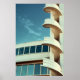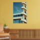 Um céu azul atrás de um prédio de deco de arte com uma esteira espiral e muitas janelas.