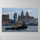 O rebocador SVITER AMAZONAS atravessa a doca de ferry Mersey e o edifício Liverpool Liver com as duas aves do fígado no topo.