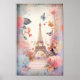 Poster with a stylized Eiffel tower image surrounded by pretty butterflies and delicate garden flowers.
