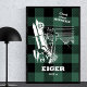 Um poster original de montanha para o monte Eiger 3967 m nos Alpes Berneses na Suiça, Europa. O texto Climb em cada montanha se refere à famosa canção do filme The Sound of Music. A imagem representa um par de esqui, uma mochila, um palito alpinista e um veado-roe - todos os acessórios necessários para o alpinismo. O fundo é criado com um padrão de xadrez de búfalo verde da floresta. A ideia de presente de excelente para cada esquiador, caminhador, montanhista, alpinista, aventureiro que foi ou deseja ir à cimeira de Eiger.