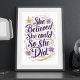 Esta arte de parede inspiradora mostra a poderosa citação, "Ela Acreditava que poderia fazê-lo," em uma escrita arrojada e elegante roxa, destacada com detalhes de brilho dourado. A design é aprimorada com delicadas flores lavandas e estrelas ouros, criando uma bela e elevadora peça para qualquer quarto. Perfeito por adicionar um toque de motivação e encanto feminino ao seu espaço, este impressão faz um presente pensativo para qualquer um que persegue seus sonhos.