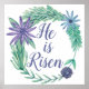Ele é Risen. Um belo poster religioso com uma bela coroa floral de roxo e verde. Estas lindas flores aquáticas se regozijam com Jesus Cristo. Bonito presente cristão.