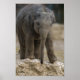 Um bebê elefante explorando os arredores. Seus pés grandes tentando subir na rocha.