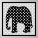 Este design de arte gráfica digital apresenta um padrão de silhueta bolinhas preto e branco em forma de elefante. O elefante é colocado sobre uma cinza e fundo monocromático branco de bolinhas com pontos brancos.