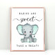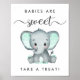 Sinal neutro em relação ao gênero para o seu chá de fraldas com "Bebês são doces, tratem" escrito em uma mistura de simples tipografia de cinzas moles e um roteiro de na moda com baloiços e uma aquarela verde de menta pastel de um elefante bebê.