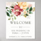 Esta bela placa de boas-vindas do casamento apresenta lindas flores aquáticas em tons ricos de marsala, amarelo ouro, verde profundo e cor-de-rosa pincelada. Arte floral via www.createthecut.com.