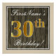 Este design de poster simples e bolsa mensageifesta de aniversario elegante apresenta uma mensagem personalizada como "aniversário de 30 anos!" (com o "30" a ter um aspecto de cor dourada falsa/imitação) dentro de uma área quadrada de aparência de madeira rústica/imitação com um contorno de fronteira simples. O nome está em um texto elegante, de cor branca, parecido com script, e pode ser personalizado. Uma poster personalizada como esta poderia talvez ser usada como decoração em uma festa para alguém que comemora seu trigésimo aniversário. [~Z0000233]