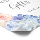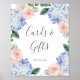 Este elegante sinal de hydrangea azul com cartões e presentes brancos é perfeito para um casamento de primavera ou verão ou para um chá de noiva. O design floral clássico apresenta suaves hortênsias em azul de aguarela acentuadas com flores cor-de-rosa neutras e folhas verdes. A linha de texto na parte inferior do sinal pode ser personalizada com a data, os nomes da noiva e do noivo, ou uma mensagem curta como "Obrigado". Este sinal pode ser usado para um casamento ou qualquer evento ou festa.