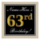 Este design simples e bolsa mensageifesta de aniversario elegante apresenta uma mensagem personalizada como "Name-Here's 63rd Birthday!" (com o "63º" a ter um aspecto de cor dourada falsa/imitação) dentro de uma área quadrada de cor preta com um contorno de fronteira simples. O nome está em um texto elegante, de cor branca, semelhante a script, e pode ser personalizado. Uma poster personalizada como esta poderia talvez ser usada como decoração em uma festa para alguém que comemora seu sessenta e terceiro aniversário. [~Z0000236]