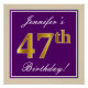Este design simples e elegante de cartaz de festa de aniversário apresenta uma mensagem personalizada como "Aniversário de 47 anos de Jennifer!" (com o "47" tendo uma aparência dourada falsa/imitação) dentro de uma área quadrada de cor roxa com um simples contorno de borda. O nome está em um texto elegante com aparência de letra cursiva branca, e pode ser personalizado. Um cartaz de festa de aniversário personalizado como este poderia ser usado como decoração em uma festa realizada para alguém que está celebrando seu quadragésimo sétimo aniversário.