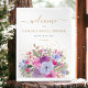 Bem-vindos aos seus convidados ao Chá de panela da Wonderland de inverno com este sinal encantador. Com flores roxas pintadas à mão, sotaques de ouro elegantes. Entra numa terra maravilhosa de inverno com o nosso Elegante Chá de panela Floral de inverno Bem-vindo a Sinalizar tons de roxo, azul-gelo, rosa e verde-sábio. As flores corajosas e o falso confetti dourado adicionam um toque de glamour, enquanto a letra elegante do roteiro define o tom para uma celebração sofisticada. Coloque a cena para o seu chá de panela de inverno ou de Natal com este belamente traçado cartaz, mostrando a magia da estação através de flores de aquarela pintadas à mão.