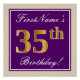 Este design simples e bolsa mensageifesta de aniversario elegante apresenta uma mensagem personalizada como "35.º Aniversário do Primeiro Nome!" (com o "35.º" a ter uma aparência falsa/imitada de cor dourada) dentro de uma área quadrada de cor roxa com um contorno simples de fronteira. O nome está em um texto elegante, de cor branca, parecido com script, e pode ser personalizado. Uma poster personalizada como esta poderia talvez ser usada como decoração em uma festa para alguém que comemora seus trinta e cinco anos. [~Z0000238]