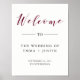 Este assombroso sinal de boas-vindas do casamento mostra a caligrafia marsala / burgundy colorida junto com o texto preto moderno, num fundo branco elegante.