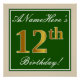 Este design simples e bolsa mensageifesta de aniversario elegante apresenta uma mensagem personalizada como "ANameHere's 12 Birthday!" (com o "12" a ter uma aparência falsa/imitada de cor dourada) dentro de uma área quadrada verde com um contorno de fronteira simples. O nome está em um texto elegante, de cor branca, semelhante a script, e pode ser personalizado. Uma poster personalizada como esta poderia talvez ser usada como decoração em uma festa para alguém que comemora seu décimo segundo aniversário. [~Z0000235]
