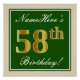 Este design simples e bolsa mensageifesta de aniversario elegante apresenta uma mensagem personalizada, como "NameHere's 58th Birthday!" (com o "58º" com um visual falsa/imitado de cor dourada) dentro de uma área quadrada verde com um contorno simples de fronteira. O nome está em um texto elegante, de cor branca, semelhante a script, e pode ser personalizado. Uma poster personalizada como esta poderia talvez ser usada como decoração em uma festa para alguém que comemora seus cinquenta oitavos anos. [~Z0000235]