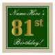 Este design simples e bolsa mensageifesta de aniversario elegante apresenta uma mensagem personalizada como "Name-Here's 81rua Birthday!" (com a "81ruas" com um olhar falsa/imitado de cor dourada) dentro de uma área quadrada verde com um contorno simples de fronteira. O nome está em um texto elegante, de cor branca, semelhante a script, e pode ser personalizado. Uma poster personalizada como esta poderia talvez ser usada como decoração em uma festa para alguém que comemora seu oitenta aniversário. [~Z0000235]