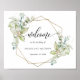 Bem-vindos aos seus convidados com este sinal horizontal de boas-vindas (ou qualquer outro evento) de Casamento elegante com um quadro hexágono atraente com detalhes de Eucalyptus verde que enquadram a sua mensagem de boas-vindas. Bem-vindos à bela caligrafia manuscrita. Aquarela com eucalipto verde numa bela mistura de matizes verdes, azuis, beige, amarelos tan e laranja. 8" x10" é apenas o tamanho padrão, há uma variedade de tamanhos disponíveis para você escolher. Fácil de enquadrar ou colar/grampear a MDF barato. Parte da nossa coleção "Elegante Verde Eucalyptus Wedding and Events" com uma variedade de produtos coordenadores a escolher.
