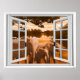 Vista do sol com elefantes, cena de janela falsa, para uma parede de escritório sem janelas. Poster de cenas de ilusão óptica divertida e realista para um escritório ou uma parede de estudo.