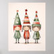 Três adoráveis elfos de Natal vestidos de ternos verdes e vermelhos festivos, cada um com chapéus altos e únicos decorados com estrelas, listras e padrões de inverno. Seu estilo fofo e minimalista captura o espírito de feriado de uma maneira deliciosa.