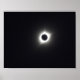 O eclipse solar total, revela um céu escuro, e grandes proeminências da coroa solar, indo muito além do disco lunar.