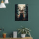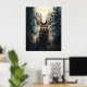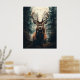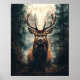 Uma cena poderosa e dramática de um alce parado orgulhosamente na floresta, suas majestosas galhadas acima da floresta densa. As sombras profundas e a atmosfera nebulosa ao redor da alce criam um senso de mistério e força, capturando a beleza bruta da natureza.