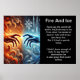 Um abraço elementar é representado nesta representação artística de duas mãos, fogo e gelo. A mão azul gelada, girando com gelo e gelo, representa frio e clareza. A feroz mão laranja e vermelha, girando com chamas e fumaça, representa calor e paixão. O fundo é uma mistura gradiente de tons escuros e enfumaçados, destacando o contraste. Os efeitos da luz enfatizam o tema elementar. "Fogo e Gelo" está no topo em uma tipografia ousada e moderna.