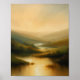 Uma pintura de sereno e de óleo etéreo que representa um lago tranquilo enterrado entre colinas macia e rolante. O céu é um ouro quente e uma matiz âmbar, lançando um brilho suave que reflete perfeitamente na água estática abaixo. A atmosfera nebulosa encobre a paisagem distante, criando uma qualidade de sonho e um sentimento de paz e solidão. Os pincéis são macios e misturados, enfatizando a harmonia e a beleza silenciosa da natureza.