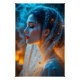 Um retrato sonhador, mágico de uma mulher serena com olhos suavemente fechados e lábios vermelhos brilhantes. Ela é iluminada por iluminação dupla: ascensão de radiância laranja quente de baixo e tons azuis legal descendo de cima, lançando um brilho dramático, porém pacífico, em suas características. Espalhada sobre a cabeça dela está um véu azul brilhante que brilha e que brilha e pega a luz etérea. A atmosfera está viva com minúsculos brilhos azuis e dourados flutuando no ar, entrelaçando-se com delicados caracóis de fumaça. Atrás dela, um fundo suave brilha suavemente com bordos laranja, adicionando calor ao ambiente místico. O retrato é altamente detalhado e fotorealista, com um toque de encanto fantástico.