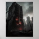 Uma torre desmoronante, estrangulada por vinhas sem vida, queima de dentro contra o pano de fundo de uma cidade morto. Carros abandonados e árvores esqueletais cercam o inferno, seu silêncio contrasta com o violento brilho que vaza de janelas quebradas. A cena fala de um mundo antigo salvação — onde o fogo não é uma força de esperança, mas o último batimento cardíaco de uma civilização engolida pela decadência.
