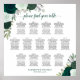 Procurando um assento impressionante para sua recepção de casamento? Não vejam mais que este belo design, com rosas pintados à mão em tons de verde esmeralda e sábio, rodeados por folhas de eucalipto e verde de jardim. Com espaço para 130 nomes em 13 mesas de 10 assentos cada, este assento é perfeito para uma gama de tamanhos de casamento. A elegante caligrafia escrita adiciona um toque de sofisticação, e há espaço para os nomes do casal e a data do casamento no fundo. Seja o seu casamento formal ou casual, este belo gráfico de assentos de bico atinge o equilíbrio perfeito entre rústico e clássico, fazer-o um ajustado excelente para qualquer celebração.