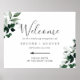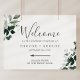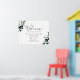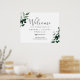 Esta poster de boas-vindas direcionais de esmerald greenery é perfeita para um casamento de boho. A elegante, porém rústica, design apresenta folhas de cor verde-d-água escura e umeucalipto com uma moderna sensação de floresta boêmica. Personalize o poster com o nome da noiva e do noivo, e a data do casamento.