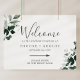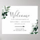 Esta poster de boas-vindas direcionais de esmerald greenery é perfeita para um casamento de boho. A elegante, porém rústica, design apresenta folhas de cor verde-d-água escura e umeucalipto com uma moderna sensação de floresta boêmica. Personalize o poster com o nome da noiva e do noivo, e a data do casamento.