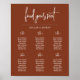 Um gráfico moderno e elegante de assentos de mesa em terracotta queimou fundo umber e um tema rústico de madeira boho com uma letra casual de caligrafia. Perfeito para gráficos de assentos de mesa de até 6 mesas.