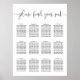 Gráfico de assentos de hóspedes em preto clássico e branco, "Por favor, encontre seu assento" no topo da lista de caracteres brancos de escrita manual, com suas tarefas de mesa de hóspedes por baixo. Espaço previsto até 12 mesas.