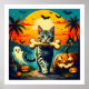 Este design capta uma divertida aventura do Dia das Bruxas: um gato de mesa inteligente desfila orgulhosamente ao longo de um caminho iluminado pela lua, segurando um osso gigante do útero em sua boca. O pano de fundo é uma explosão de cores retrorreflectoras, lançando sombras de palmeiras e enchendo o céu com morcegos vivos. Por todo o lado, lanternas brilhantes, um caldeirão borbulhante, uma casa assombrada, e um fantasma amigável marcou a cena para um maldito mágico. É uma celebração da curiosidade, do mistério e do humor inteligente - onde o bravado felino e o trocadilho científico se encontram num mundo festivo e encantador que convida tanto riso quanto admiração.