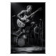 Um guitarrista explode em movimento, tocando uma guitarra elétrica, com uma banda completa ao fundo. A iluminação dramática e o tom monocromático capturam a intensidade de um show ao vivo.
