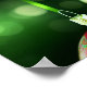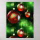 PERSONALIZE com sua própria mensagem de feriado. O ouro artístico e o escrolo verde decoram de forma positiva os Enfeites de natal vermelhos neste detalhado close-up. Os ornamentos da bola de vidro rico parecem pendurados em fita verde em frente a um fundo abstrato de verde e luzes de Natal. Um modo festivo de dizer Feliz Natal!